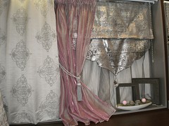 Ein weiteres Fenster in unserem Studio lockt mit seinem luxuriösen Glanz, ergänzt mit einer ungewöhnlichen Dekoration, dem geformten Ende eines römischen Rollos – ein Anhänger aus geschliffenem Glas.